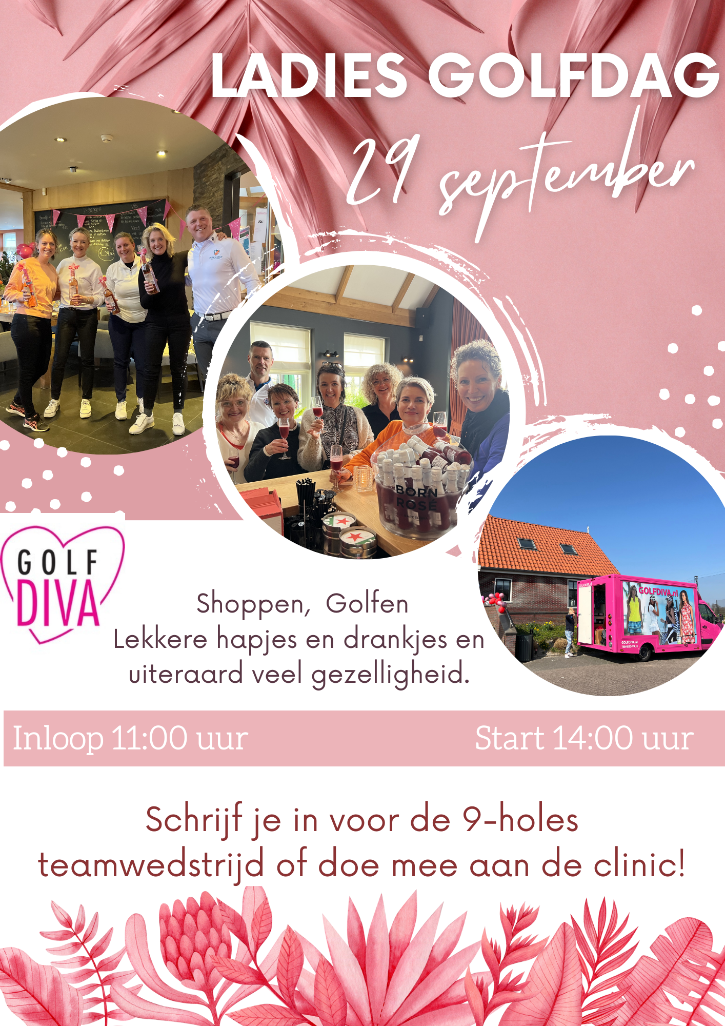 Bij ontvangst krijg je een heerlijk drankje. (de gevorderde dames kunnen lekker de baan in of aansluiten bij de clinic). De clinics worden gegeven door de professionals van de @dirkshorngolfacademy.